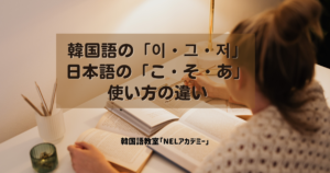 안녕하세요^^兵庫県尼崎市にある韓国語教室「NELアカデミー」です。 韓国人の韓国語を聞いていて、もしくは韓国人が話す日本語を聞いていて、韓国語の「이・그・저」と日本語の「こ・そ・あ」の使い方が、ちょっと違うなと感じたこ […]
